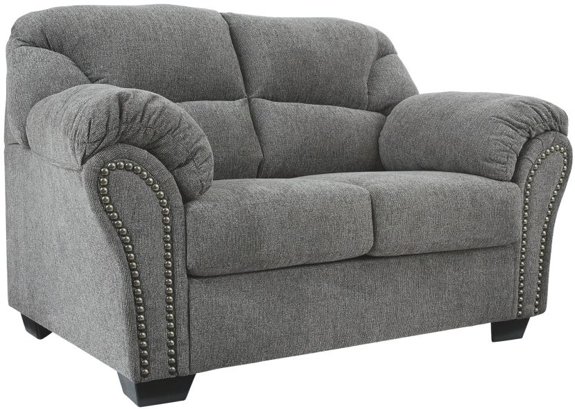 Why sacrifice comfort for style (or style for comfort) when you can have the best of both in this loveseat in pewter gray. Elements include a chic divided-back design and pillow top wrapped armrests that make nodding off all too easy. Calling attention to the elegantly flared armrests—black nickel-tone nailhead trim for a punch of cool character.