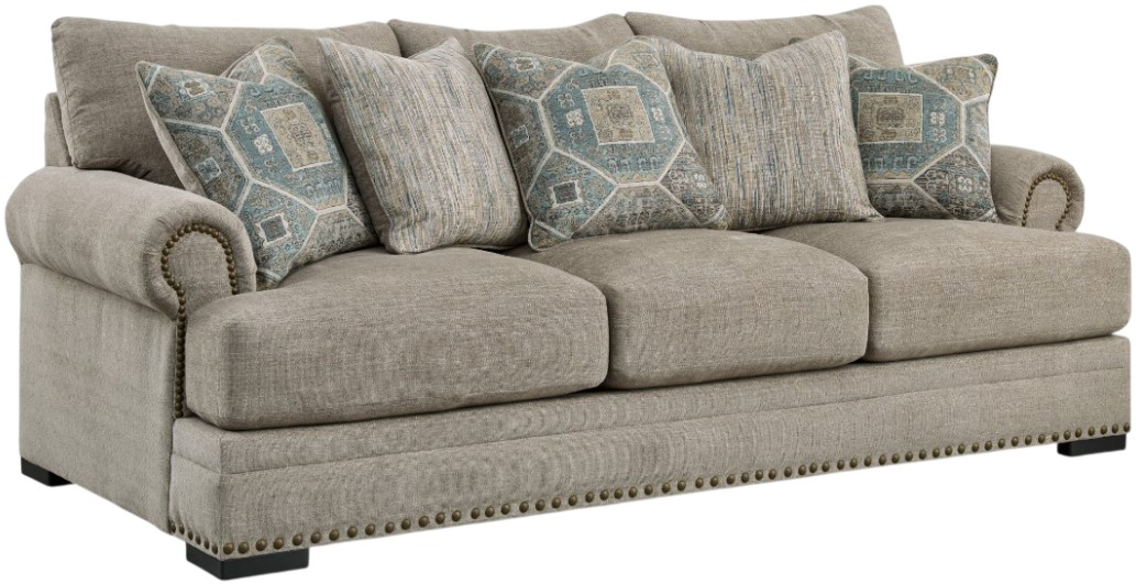 Looking to enhance your home's visual appeal? This sofa offers sophisticated design, comfort and elegance with tonal colors, roll arms and nailhead accents. Enjoy optimal coziness as you nestle into luxurious soft upholstery and feather-blend cushions.Read More
