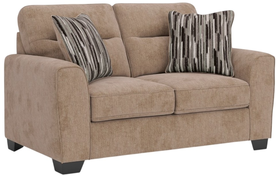 Strike a balance between the indulgent comfort you crave and the contemporary aesthetic you long for. The fabulously soft, mocha-colored upholstery of this loveseat takes neutrals to new heights. Geometric-patterned accent pillows perfect the richly on-trend aesthetic.Read More