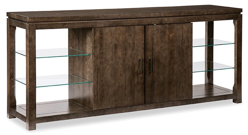 This solid wormy maple wood console cabinet from the Solid Accents Collection features a Truffle finish, 2 soft-close doors, & 4 glass shelves.