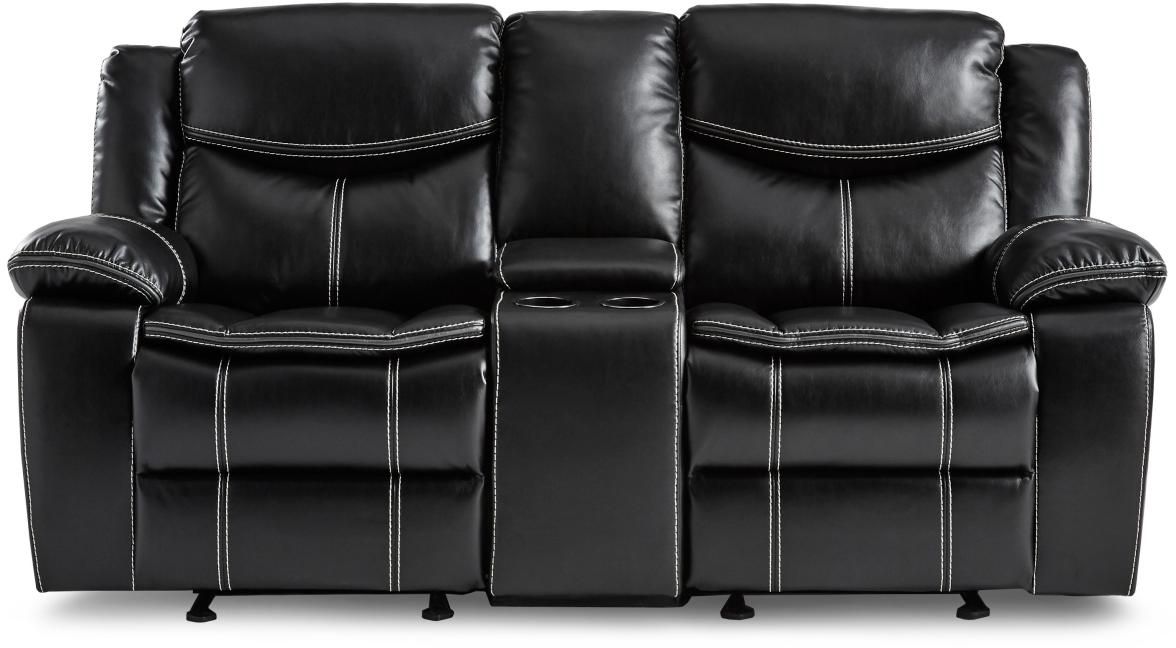 The two optional coverings – black or brown leather gel match – feature contrast welting for definition of profile and modern accenting. Manually engaged motion mechanisms allow for quick transition from seated to prone with the quick pull of a tab. Each piece in the collection has an individual function allowing for convenience and comfort. The sofa features dual reclining ends, the dual glider reclining ends of the Loveseat flank a center mounted console with storage and cup-holders, and the chair features a glider mechanism that allows for easy back and forth motion. The sectional configuration features a left side loveseat with reclining end and the right side double reclining loveseat with center console unit featuring cup holders and storage.