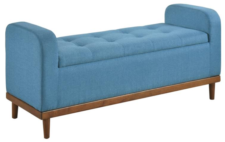 The blue textured fabric upholstery that covers the storage ottoman is perfectly complemented by the walnut finish of the solid wood support frame.