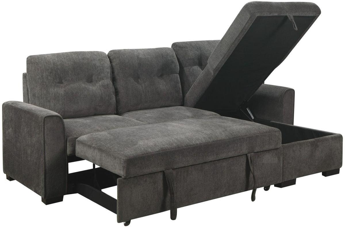 Covered in dark gray chenille and complemented by stitch tufting and track-style arms. Conveniently stored beneath the sofa is a pull-out trundle that creates a bed while the top of the attached chaise opens to reveal under-seat storage. The chaise can be configured as right or left side placement.Read More