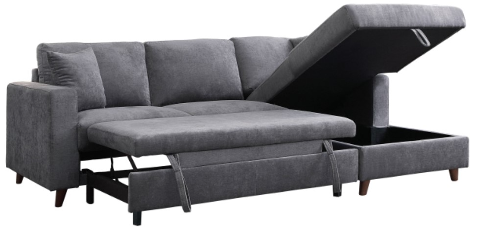 Lean against the square track arms and sink back against the fully padded cushioning, including two additional toss pillows on each side. The right side lift-up chaise adds ample storage to your living room, providing a great spot to store throw blankets, pillows, or reading material. Easily use the pull-handles to pull out the sleeper, providing guests with an impromptu bed at any time. Also available in reverse configuration with left side chaise.