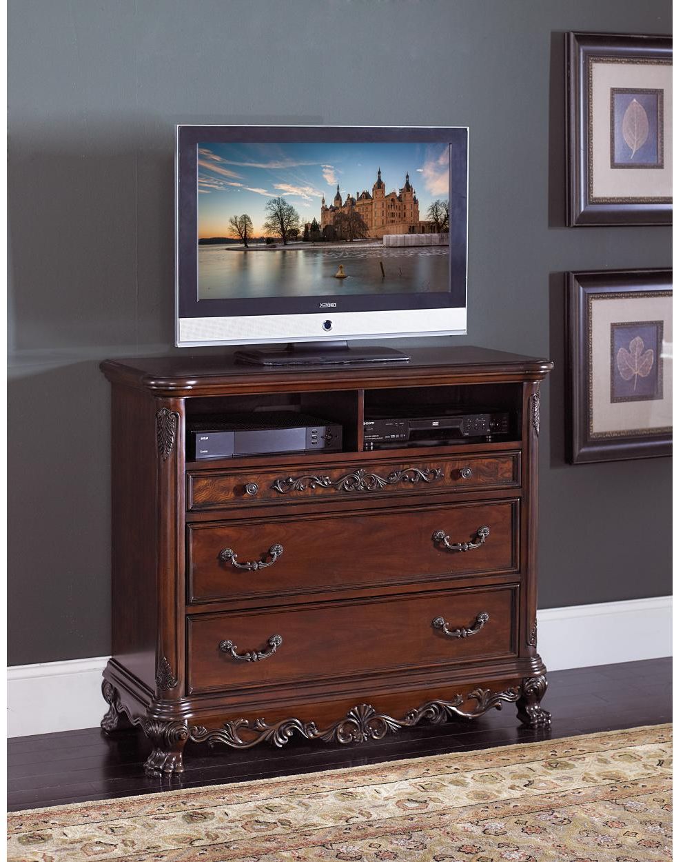 Cherry finish is highlighted by gold.