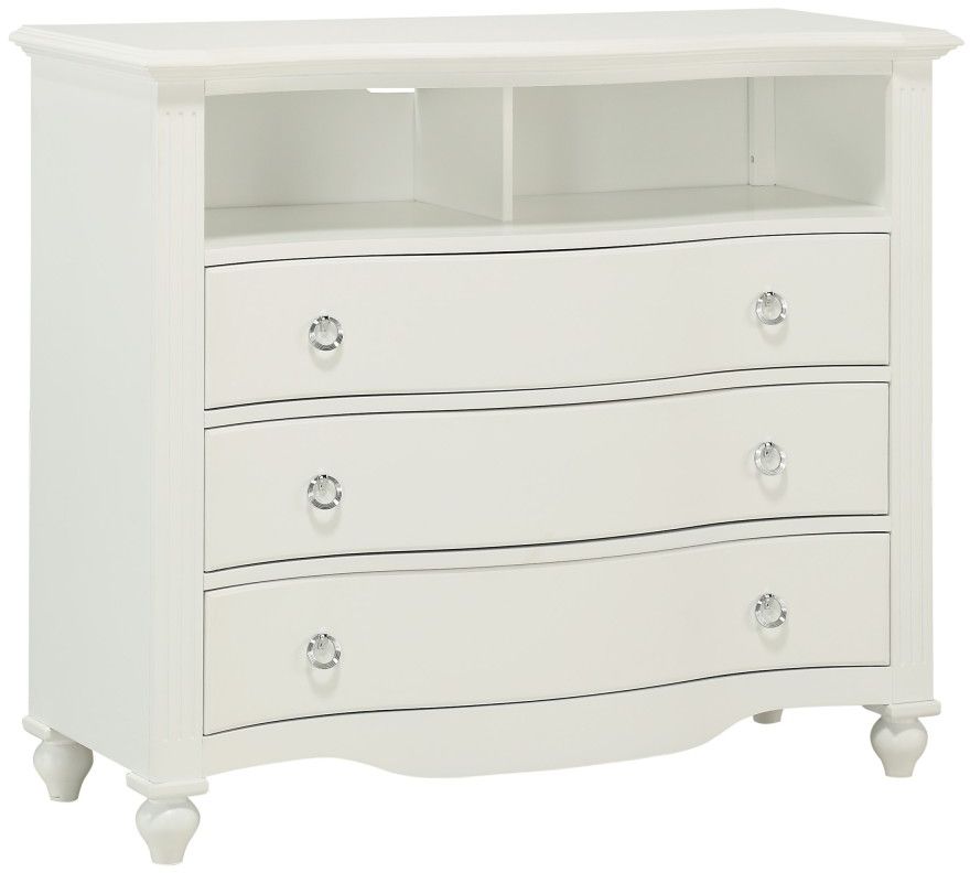 Your child's bedroom is their space to grow, learn and play. The elegant, yet whimsical styling of the Meghan Bedroom Collection by Homelegance will provide the platform from which they will enjoy those experiences for years to come. Design elements that lend to a traditional look include cherry finish, clipped corner case good tops, routed pilasters, high polish round pull hardware, turned feet and curved base rails. Downtime is all fun and games with the media chest. Open media storage allows for unobstructed access to your entertainment consoles.