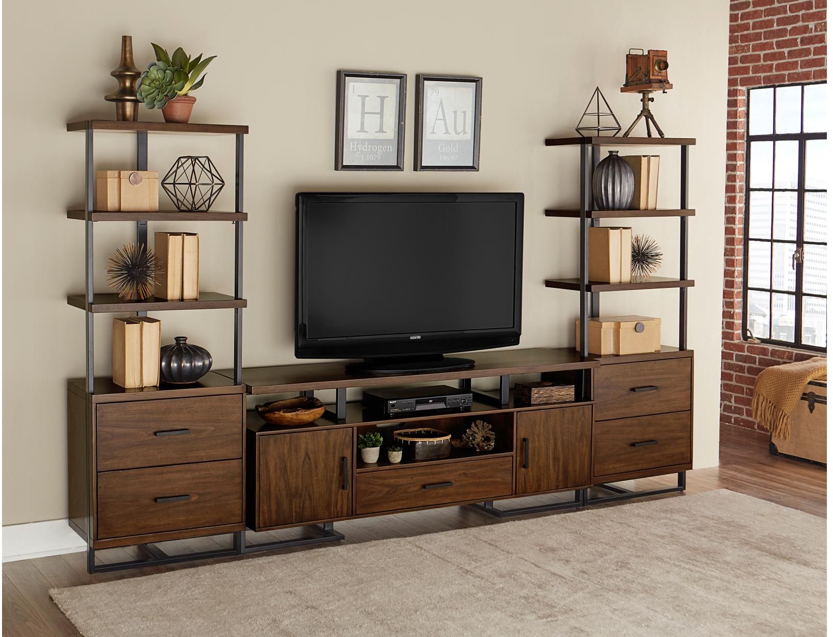Whether your home leans to transitional or contemporary design, the Sedley Collection will be the perfect fit for your needs. From the distinct walnut veneer pattern to the unique framing of the desk, bookcase and file cabinet, each design component lends to placement in a variety of TV stand settings. The dark metal horizontal hardware and metal support framing complements the finish of the group while providing distinct contrast. Convenience factors include drawer storage, reversible return desk for convenient placement within the space and open display shelves and door storage of the bookshelf. Matching bedroom, dining, home entertainment, home office and occasional sets are available in the Sedley Collection.Read More