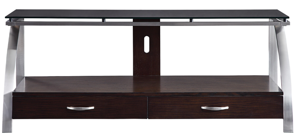 Designed for the modern home, the Tioga Collection will provide a unique look for your home entertainment space. Brushed chrome geometric support legs provide a distinct contrast to the black of the entertainment console’s floating top and espresso finish of the media access shelf. Drawers provide additional storage space.