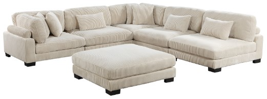 The 6-piece sectional configuration consists of two corner units paired with three armless chairs, and an ottoman