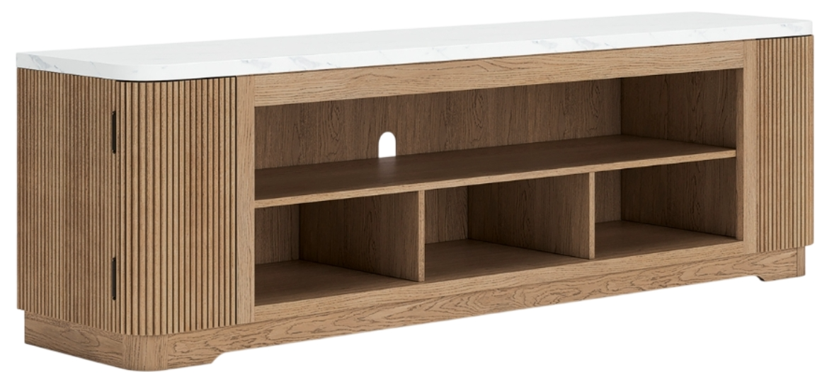 Elegance meets earthy charm in this TV stand. Crafting a contemporary living room? The faux marble top expertly pairs with the reeded base for a trend-right take on day-to-day function. Open shelving and subtly integrated storage cabinets make it easy to store and display media accessories in style.Read More