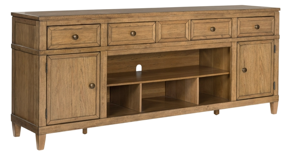 Taking a timeless approach to casual beauty, this TV stand brings easygoing elegance to the everyday. The light brown wood-tone finish seamlessly slips into your room’s aesthetic. Two spacious cabinets (each with an adjustable shelf), four drawers and an open center shelf offer plenty of storage for media and electronics.Read More