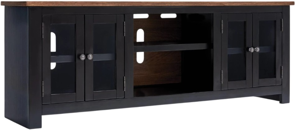Raise the bar on modern farmhouse style with the Wildenauer TV stand. Its sturdy silhouette and casual good looks are accentuated with a two-tone finish, which pairs a warm satin black base with a contrasting butcher block veneer top. Glass door cabinets with adjustable shelves offer plenty of storage for media and electronics.Read More
